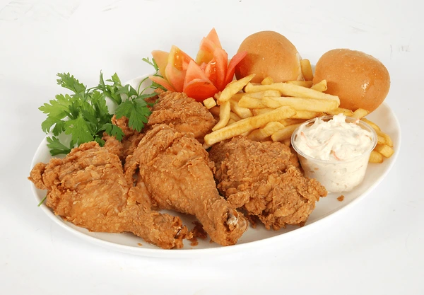 Juicy fried 2 drumstik and 2 thigh serve with small portion off fries & and bread, Garlic sauce