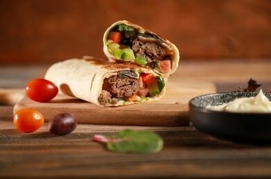 chicken kabab wrapped by bread with fresh vegetable and garlic sauce